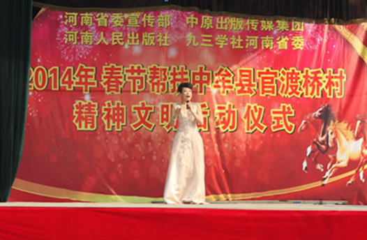 省委宣傳部副巡視員杜瑞明代表省直四家單位講了話,向官渡橋村村民送上節(jié)日的祝福。隨后,慰問團的領導向官渡橋村農民群眾和小學生贈送了文體用品。由省委宣傳部邀請的薛青、郝曉冬等省內多位知名演員為村民們表演了歌舞《田野里的春天》、豫劇《朝陽溝》選段、相聲《大腕研究》、嗩吶《百鳥朝鳳》等七個精彩的節(jié)目。在近兩個小時的演出中,臺上演員們精彩的表演,博得群眾的陣陣掌聲。省委宣傳部機關黨委專職副書記李憲林、創(chuàng)建處處長張德偉揮毫潑墨,現(xiàn)場為鄉(xiāng)親們義寫春聯(lián)。省九三學社邀請的省醫(yī)療專家為鄉(xiāng)親們傳播健康衛(wèi)生知識,現(xiàn)場檢查治療。中原出版集團和河南人民出版社為鄉(xiāng)親們贈送了科技圖書讓大家過春節(jié)時學習,整個慰問活動場面熱烈,氛圍濃厚。