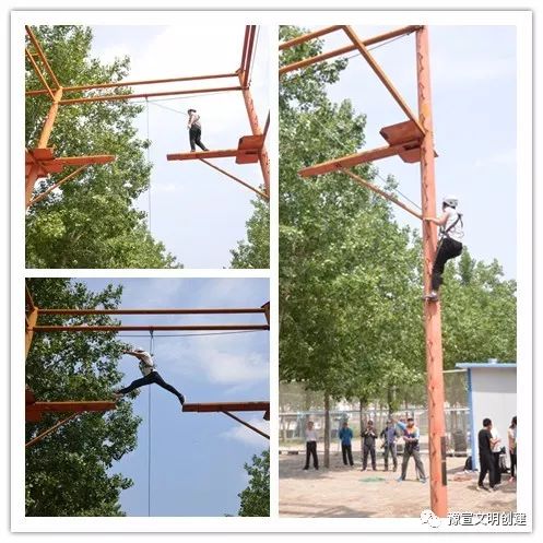 從一開(kāi)始的團(tuán)隊(duì)破冰,到考驗(yàn)智慧和勇氣的互動(dòng)游戲,大家相互配合、彼此信任,英姿颯爽、奮力拼搏。在“高空斷橋”項(xiàng)目中,隊(duì)員們爬上8米高空,躍過(guò)斷橋后折回,再?gòu)目罩薪德洹.?dāng)有隊(duì)員面對(duì)高空遲疑害怕時(shí),其他隊(duì)員都紛紛加油鼓勁,耐心等待,傳遞著集體溫暖的力量,最終所有隊(duì)員都順利完成了挑戰(zhàn)。